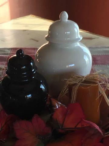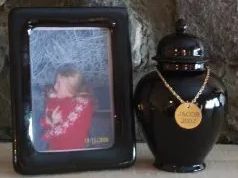 This urn is readily available in black or white. They can be personalized with a lovely gold, rose gold or silver chain and tag (see below) to hang around the top ($10).