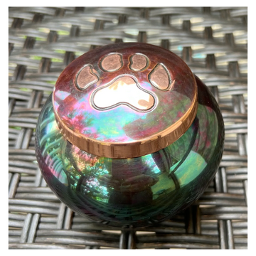 This beautiful Rose Gold urn with pawprint inlay can be personalized with the name plate of your choice hanging on a chain around the top of the urn. It will arrive in a beautiful velvet bag.